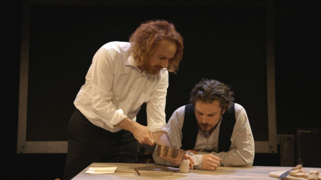 Sans oublier de mettre en contexte cette cohabitation dans la maison jaune d’Arles. Sans négliger le début de ces quelques semaines, quand la relation n’est pas passée si loin de devenir une belle amitié. Sans sauter des étapes dans le lent glissement vers la tension. Le faire de façon claire et suffisamment exhaustive, sans verser dans le documentaire. Le faire, enfin, et là fut notre plus grand défi, en une heure et quart environ, sans sacrifier la qualité, ni le respect de toutes les contraintes pré-citées.